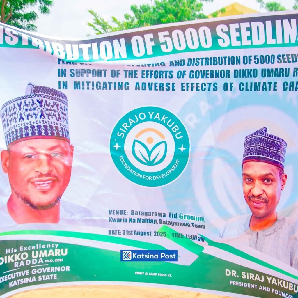 The Executive Governor of Katsina State, Malam Dikko Umaru Radda, has flagged off the planting and distribution of 5,000 tree seedlings donated by the Sirajo Yakubu Foundation for Development (SYFD). The exercise took place at the Eid Ground in Batagarawa Local Government Area, with the seedlings to be planted across the local government and beyond.
